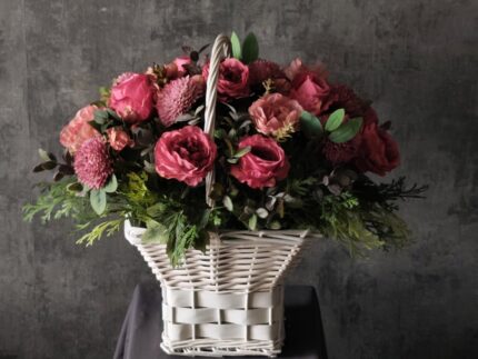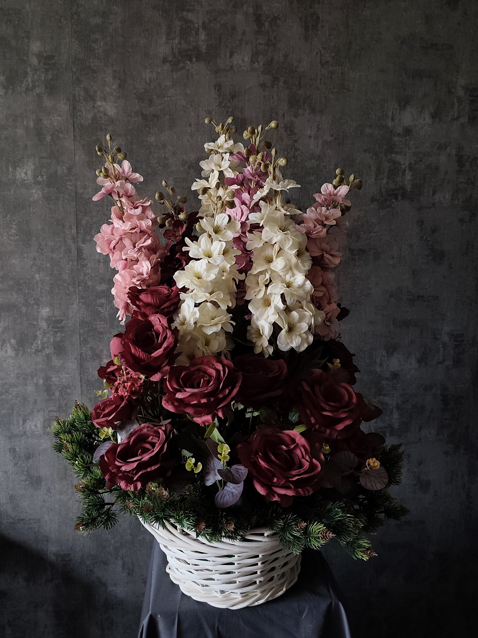 Состав: дельфиниум, розы, кипарис, хвоя, зелень.