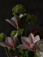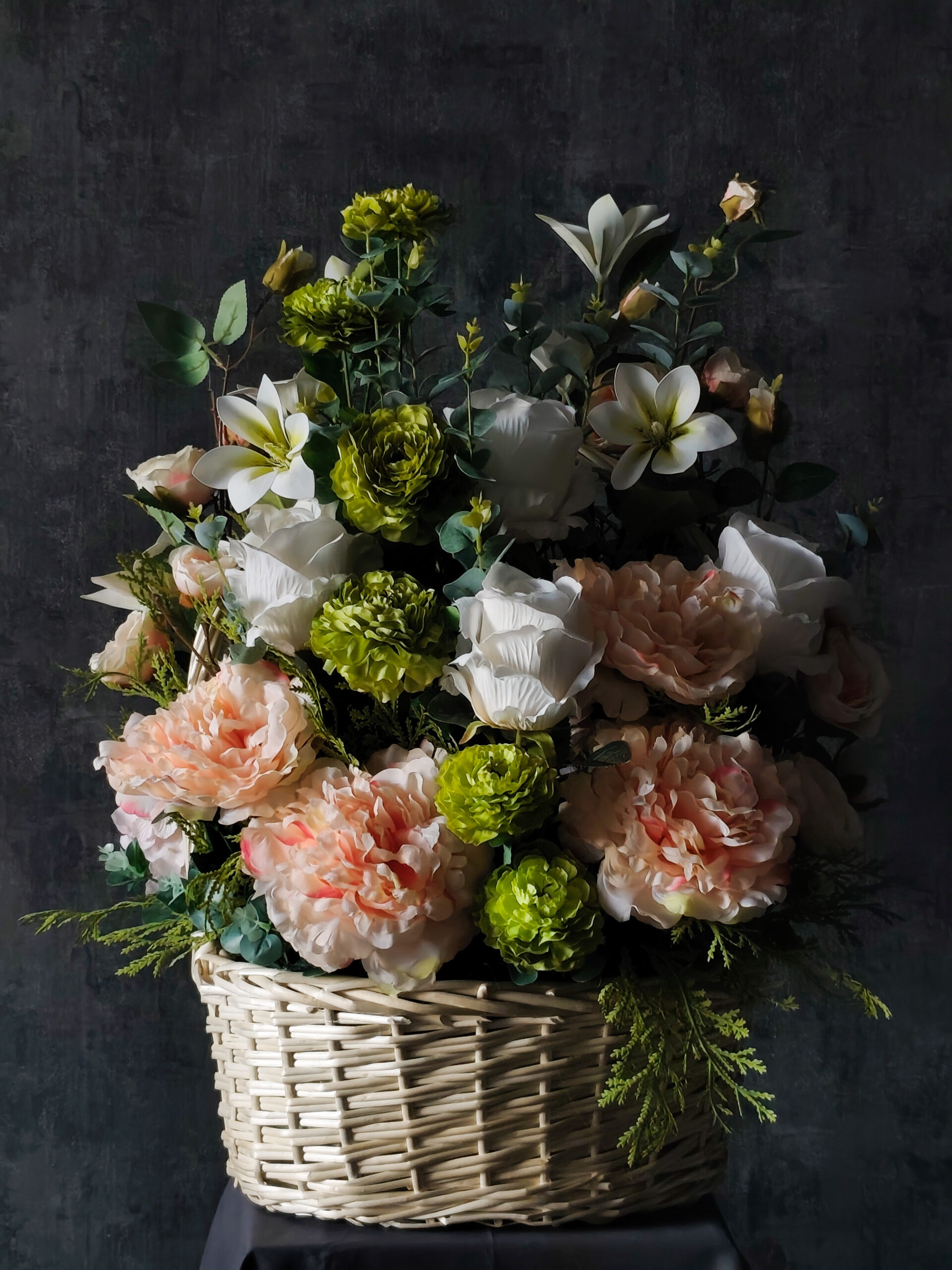 Состав: пионы, магнолия, цинния, эустома, туя, розы, эвкалипт, зелень.