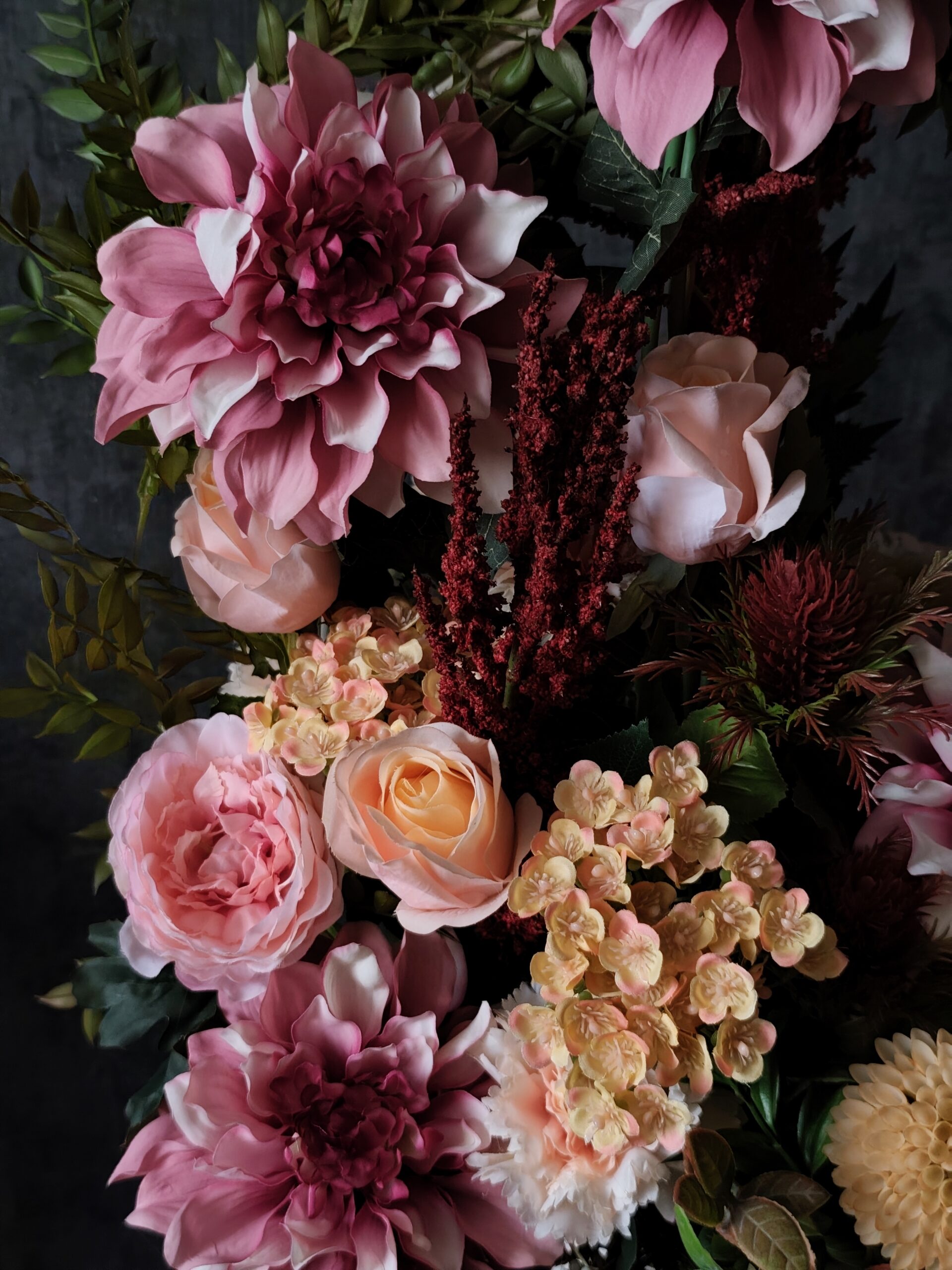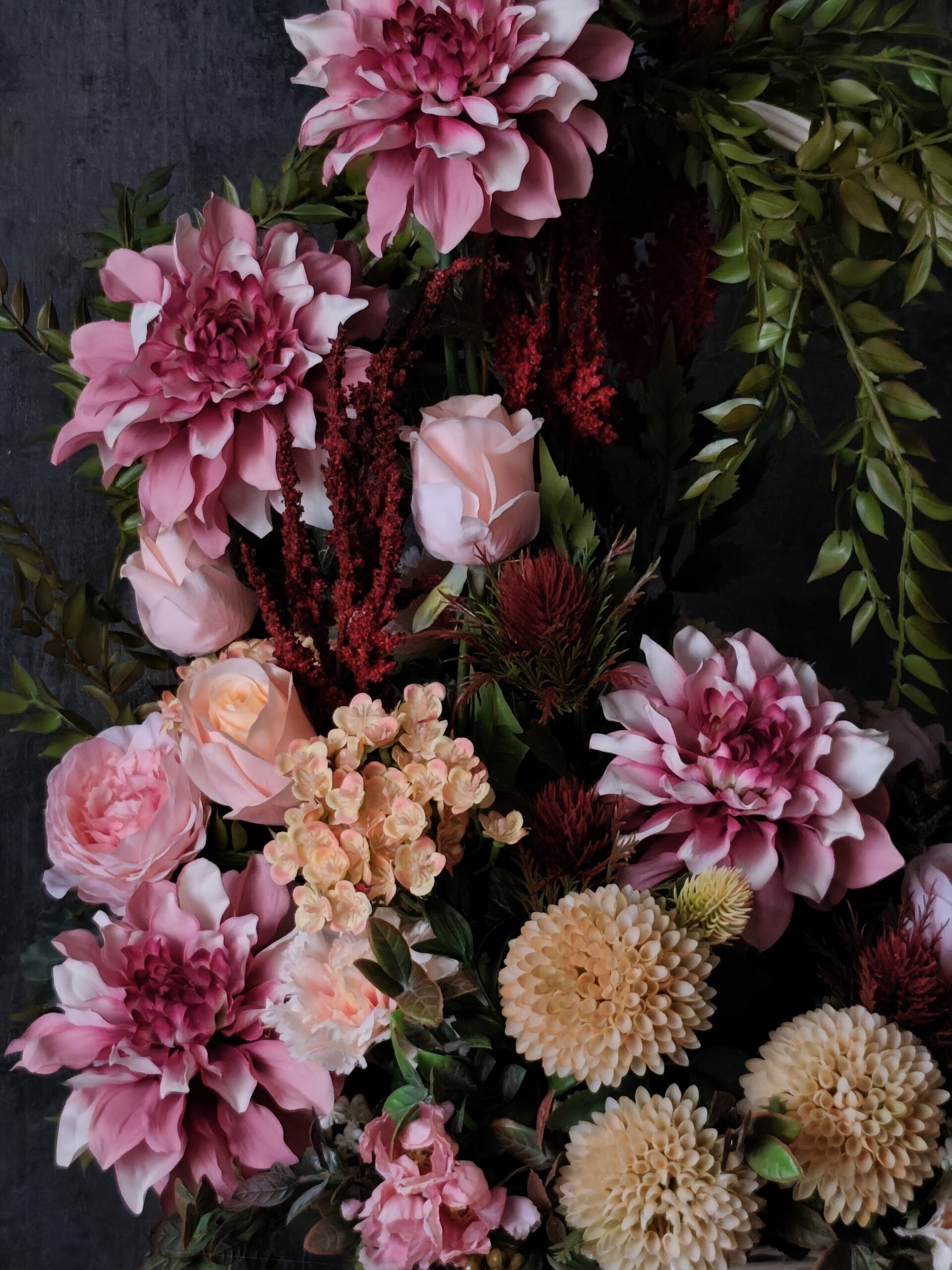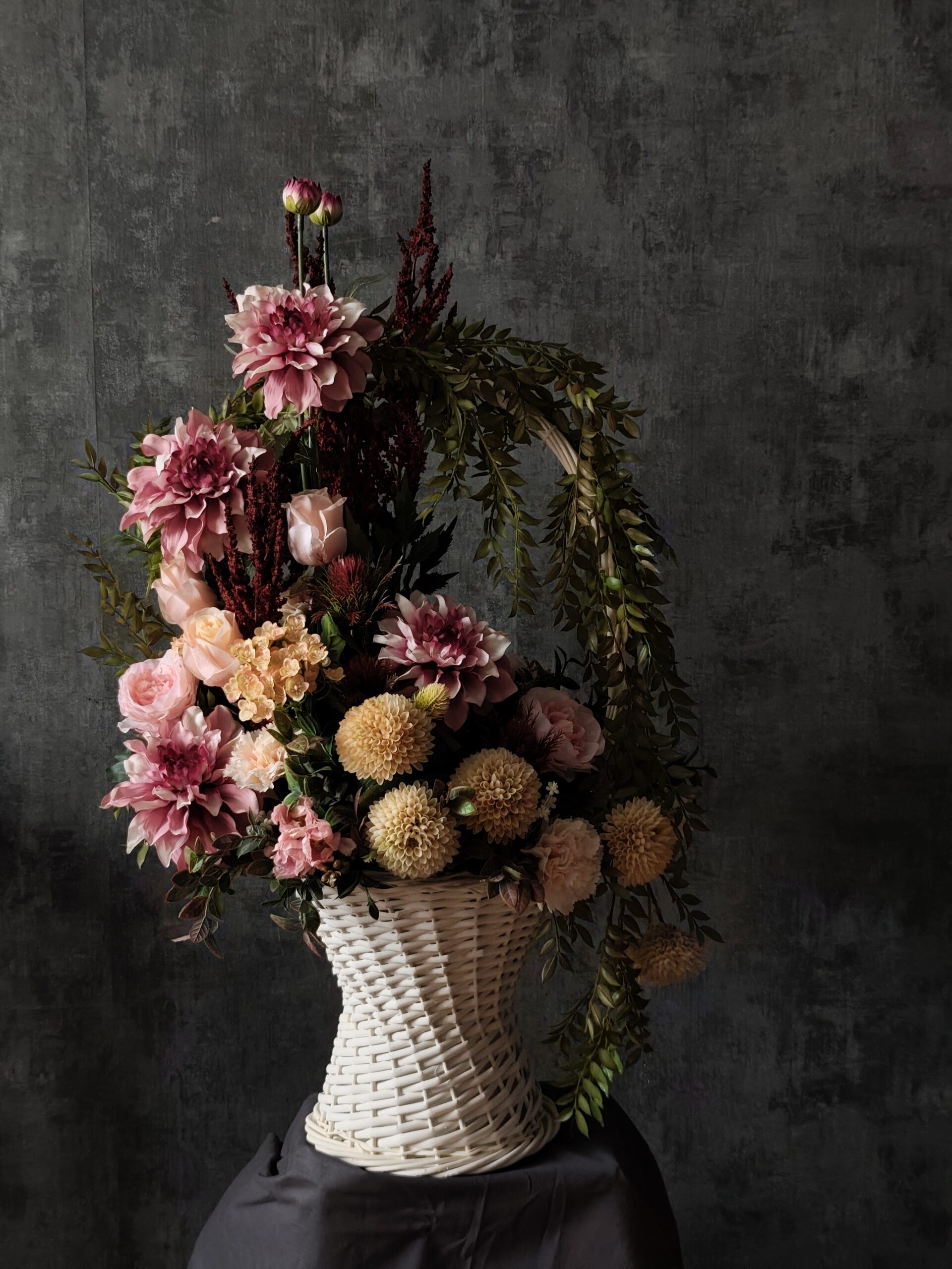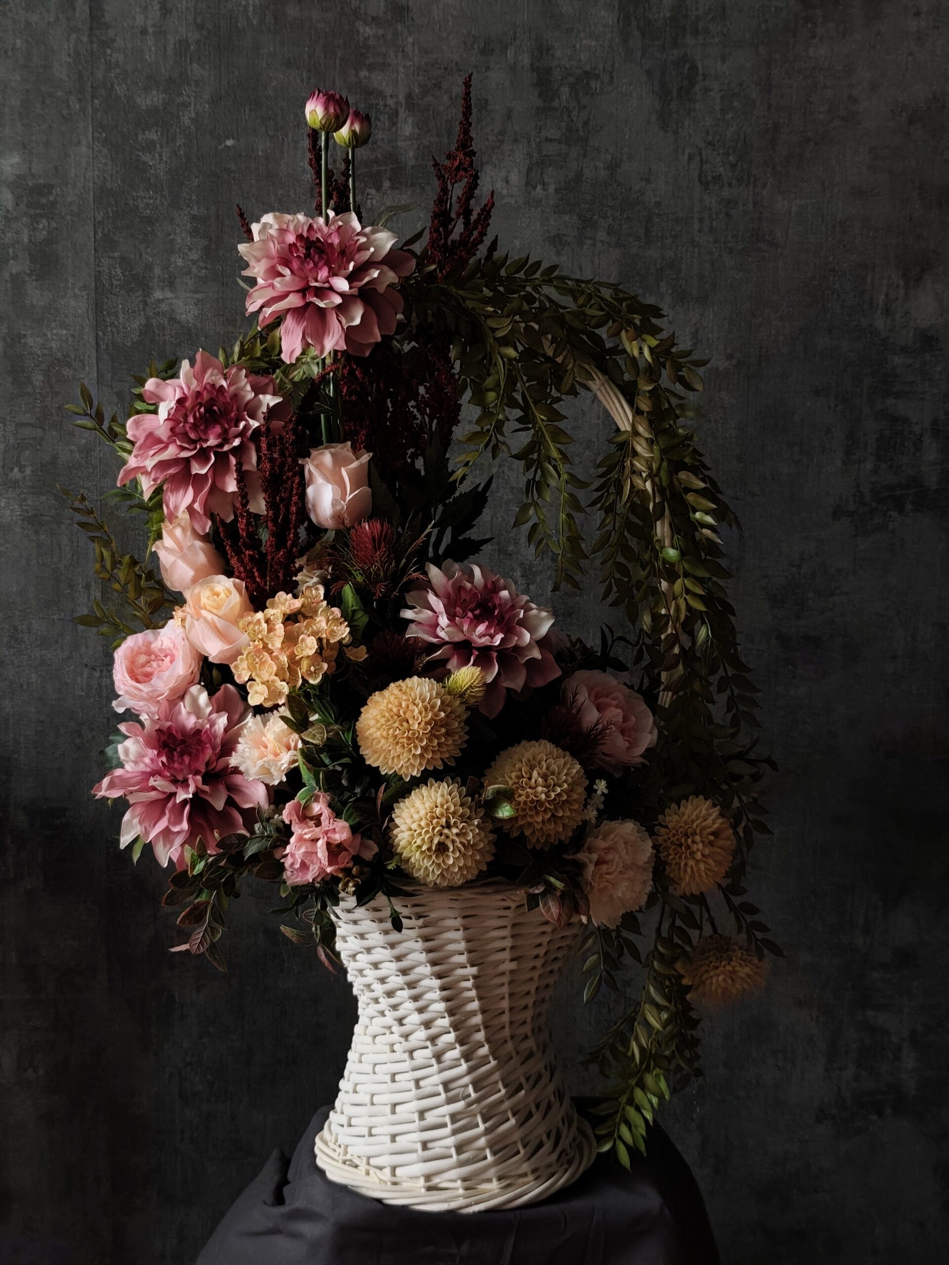 Состав: георгины, розы кремовые латексные, статика, протея, хризантемы, гвоздики, пионы, амарант, ампельная зелень ивы.